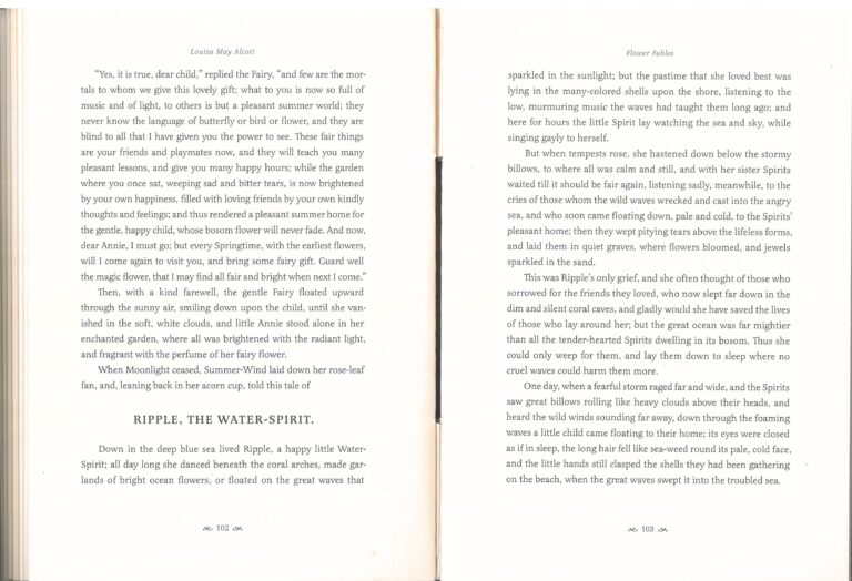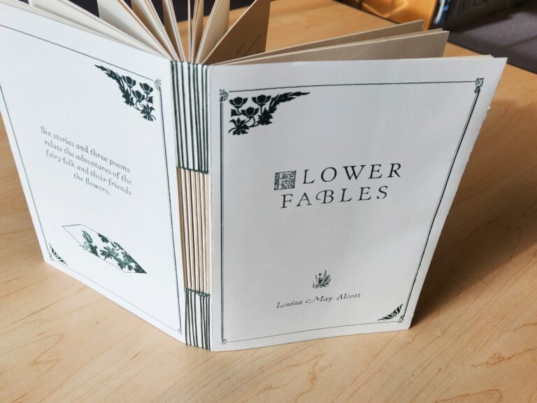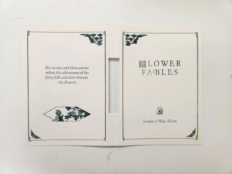 I designed a small hand-bound edition of The Flower Fables by Louisa May Alcott — author of Little Women — for my Bookarts class in the fall semester of my junior year. The project allowed me to dedicate my attention to typographic layout and production craft. I explored paragraph and character styles, typographic hierarchy, and the structure of long-form text, while also designing a colophon and copyright page to better understand book publishing conventions.