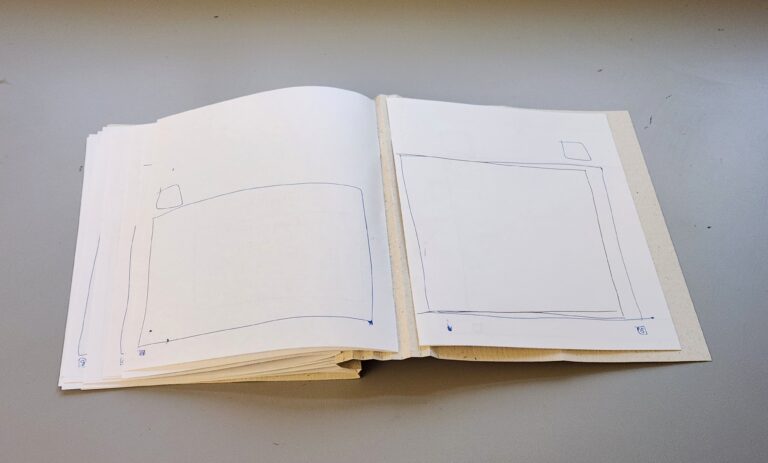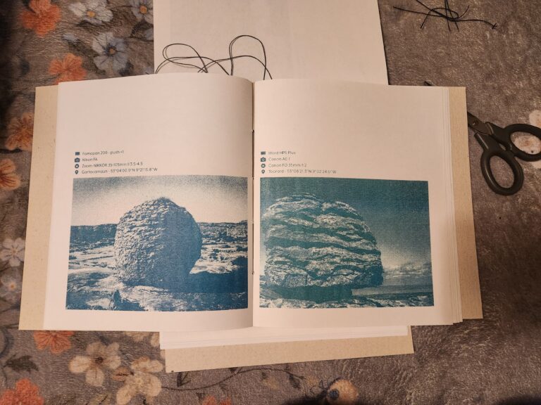 Revisiting my film photography from Ireland and the concept of my exhibition, I established a structured timeline to design, risograph and screen print, and bind a photozine. I made decisive decisions to maintain momentum, which reinforced my belief in process-based making and strengthened my confidence in navigating uncertainty through hands-on practice. I started by making a paper mock-up of the zine to determine the size, number of pages, general layout, image and text placement. Then I was able to translate this into InDesign and bring my vision to life with print ready Master copies.